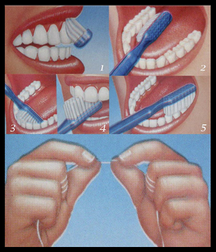 Pressione as cerdas da escova ao longo da linha da gengiva num ângulo de 45º com o longo eixo dos dentes. As cerdas devem estar em contato com os dentes e a gengiva. Imprima à escova suaves movimentos vibratórios e de pequena amplitude (4mm) durante cerca de 3 segundos. As cerdas permanecem fixas e a cabeça da escova é que execta o movimento. Repita este procedimento para cada grupo de 2 a 3 dentes. Faça com que todas as superfícies externa e interna sejam atingidas pelas cerdas. Remova a escova no sentido da gengiva para a face de mastigação do dente.